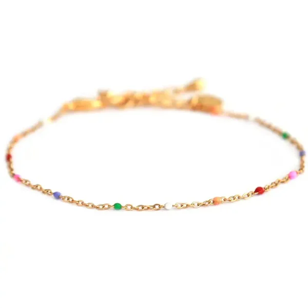 Enkelbandje van smalle schakels met gekleurde ronde kraaltjes.
