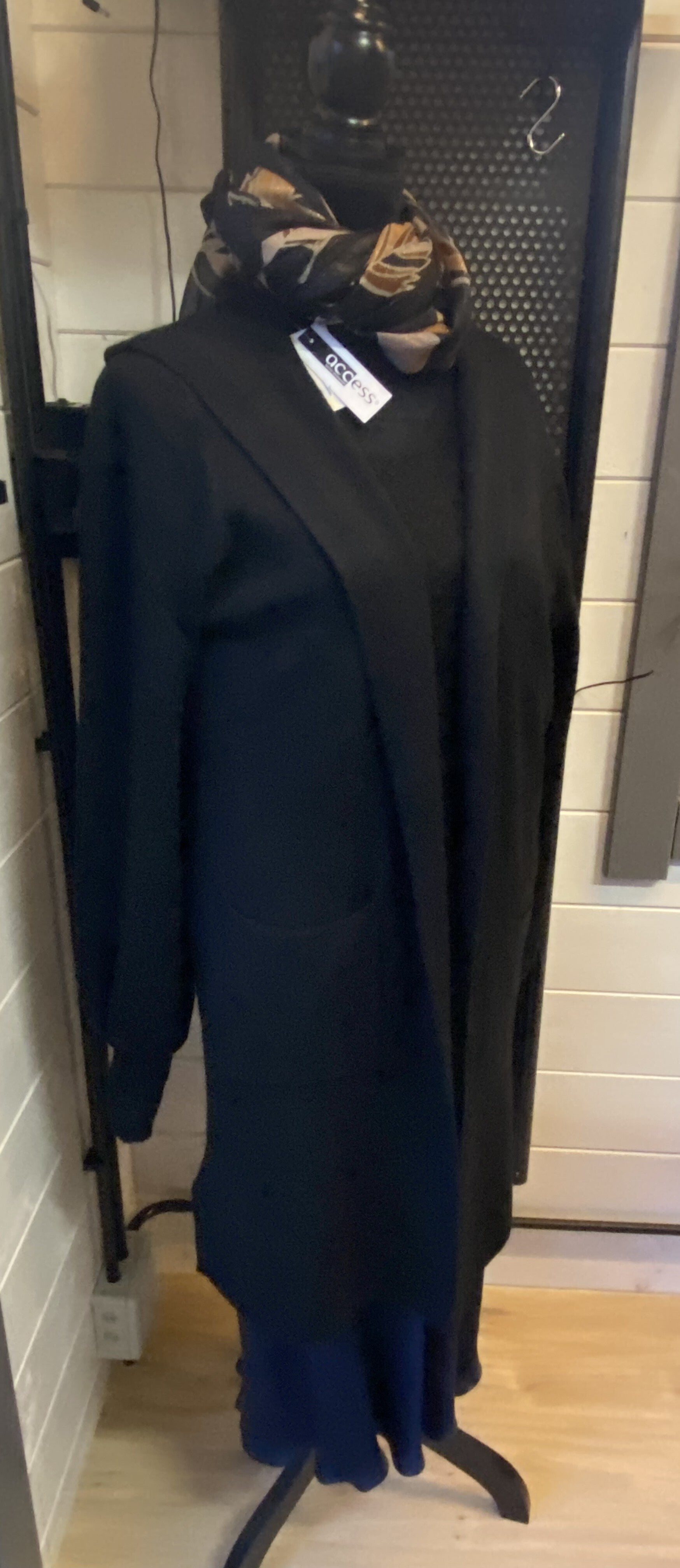 Mid-length hooded knit cardigan. Functional pockets. Length 85cm.