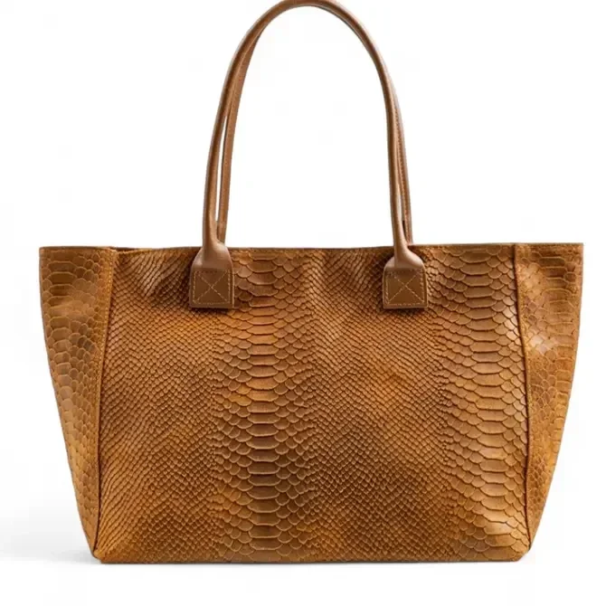 Schoudertas van echt leer met pythonprint, gemaakt in Italië. Dubbele handvatten, waardoor het gemakkelijk met de hand of op de schouder te dragen is. De tas heeft een centrale ritssluiting en een magnetische knoopsluiting. Het enkele binnenvak is met stof gevoerd en heeft een vak met ritssluiting.