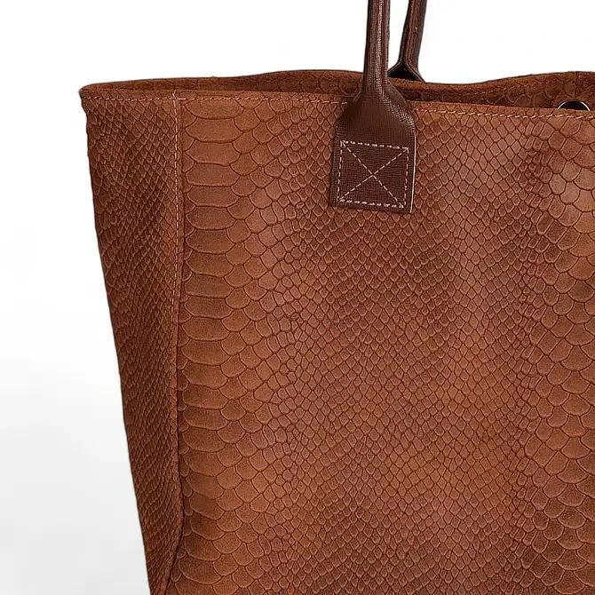 Schoudertas van echt leer met pythonprint, gemaakt in Italië. Dubbele handvatten, waardoor het gemakkelijk met de hand of op de schouder te dragen is. De tas heeft een centrale ritssluiting en een magnetische knoopsluiting. Het enkele binnenvak is met stof gevoerd en heeft een vak met ritssluiting