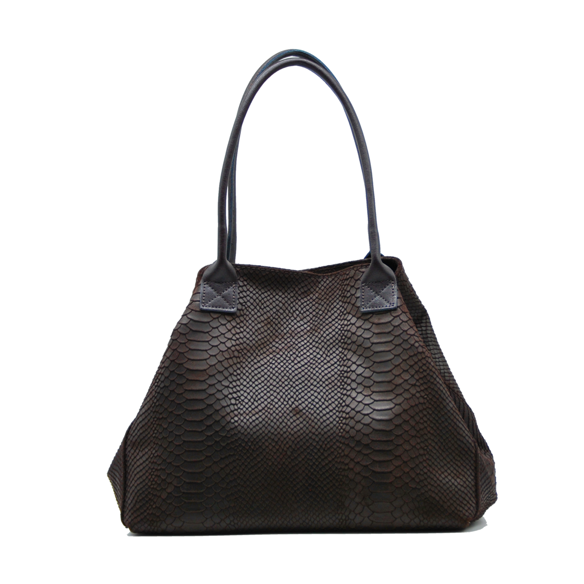 Schoudertas van echt leer met pythonprint, gemaakt in Italië. Dubbele handvatten, waardoor het gemakkelijk met de hand of op de schouder te dragen is. De tas heeft een centrale ritssluiting en een magnetische knoopsluiting. Het enkele binnenvak is met stof gevoerd en heeft een vak met ritssluiting.