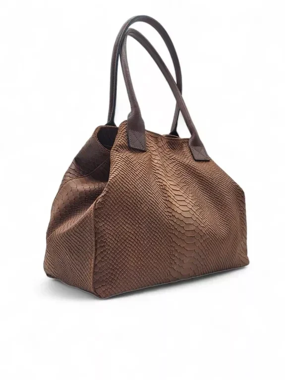 Schoudertas van echt leer met pythonprint, gemaakt in Italië. Dubbele handvatten, waardoor het gemakkelijk met de hand of op de schouder te dragen is. De tas heeft een centrale ritssluiting en een magnetische knoopsluiting. Het enkele binnenvak is met stof gevoerd en heeft een vak met ritssluiting.