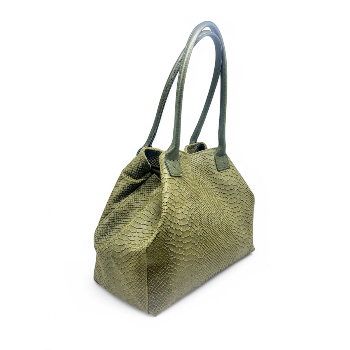Schoudertas van echt leer met pythonprint, gemaakt in Italië. Dubbele handvatten, waardoor het gemakkelijk met de hand of op de schouder te dragen is. De tas heeft een centrale ritssluiting en een magnetische knoopsluiting. Het enkele binnenvak is met stof gevoerd en heeft een vak met ritssluiting.