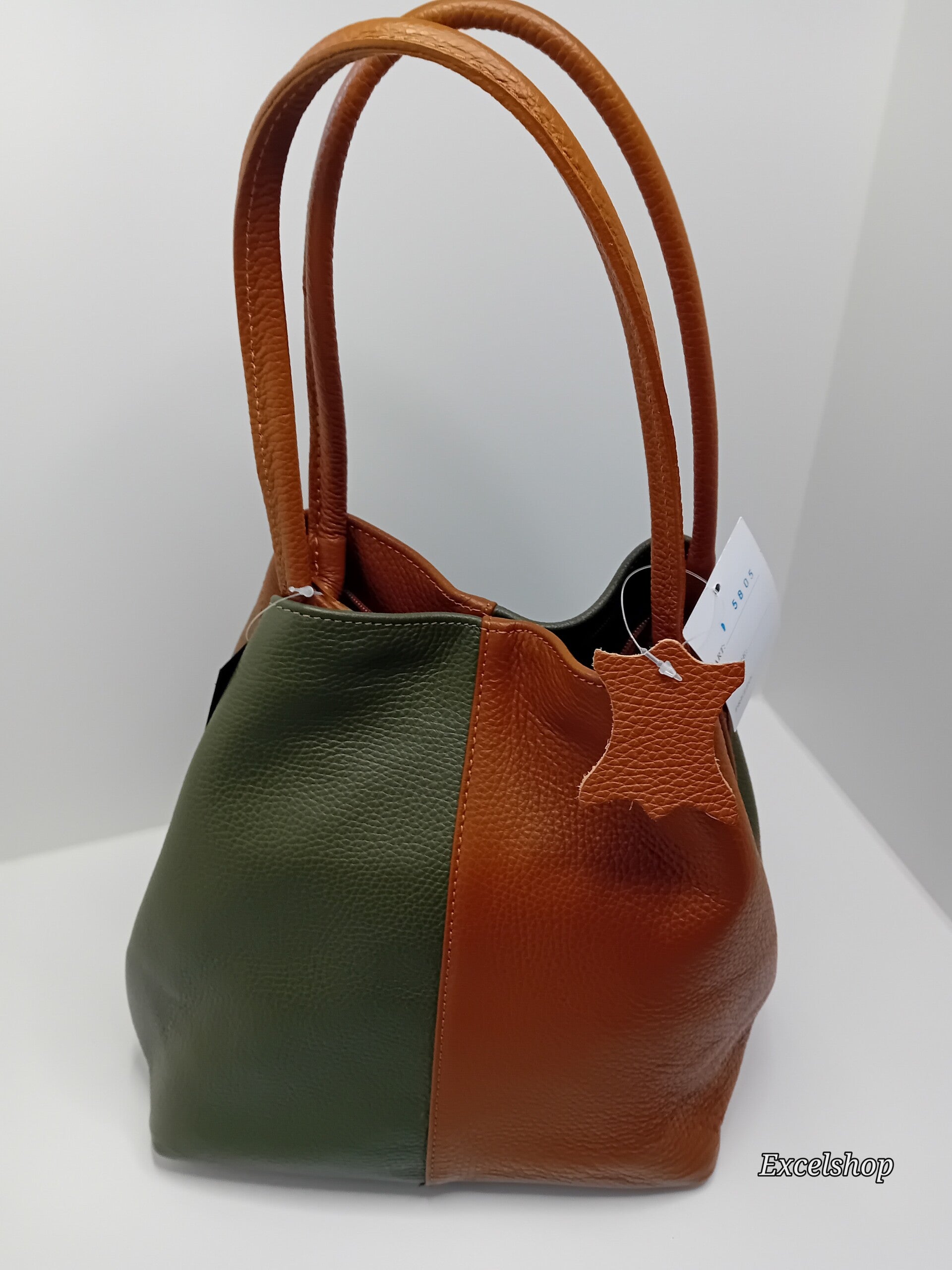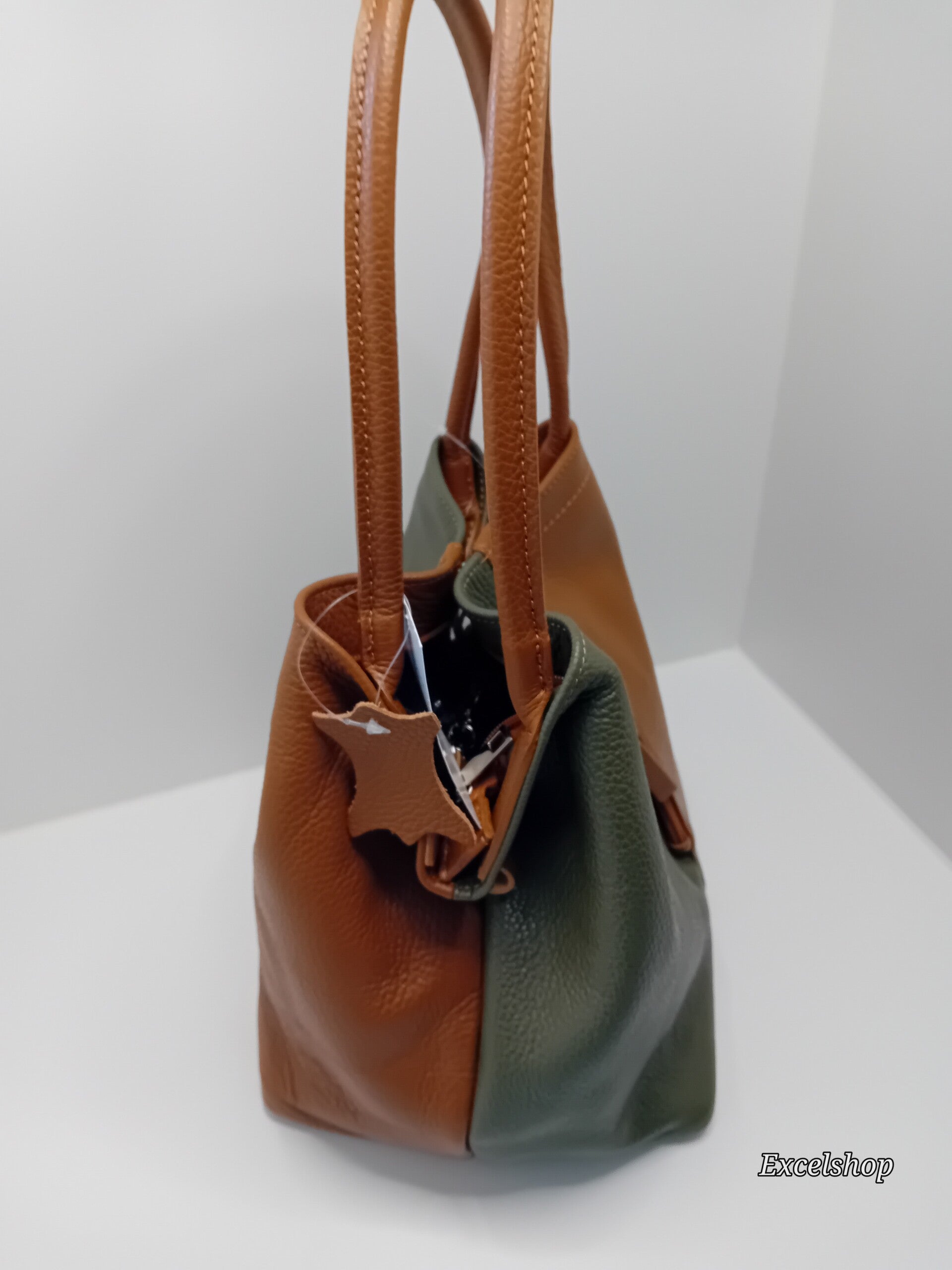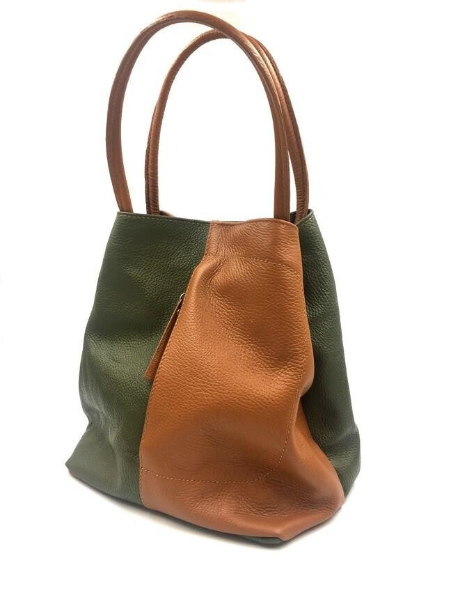 Soepel lederen tweekleurige handtas met schouderband bruin-kaki