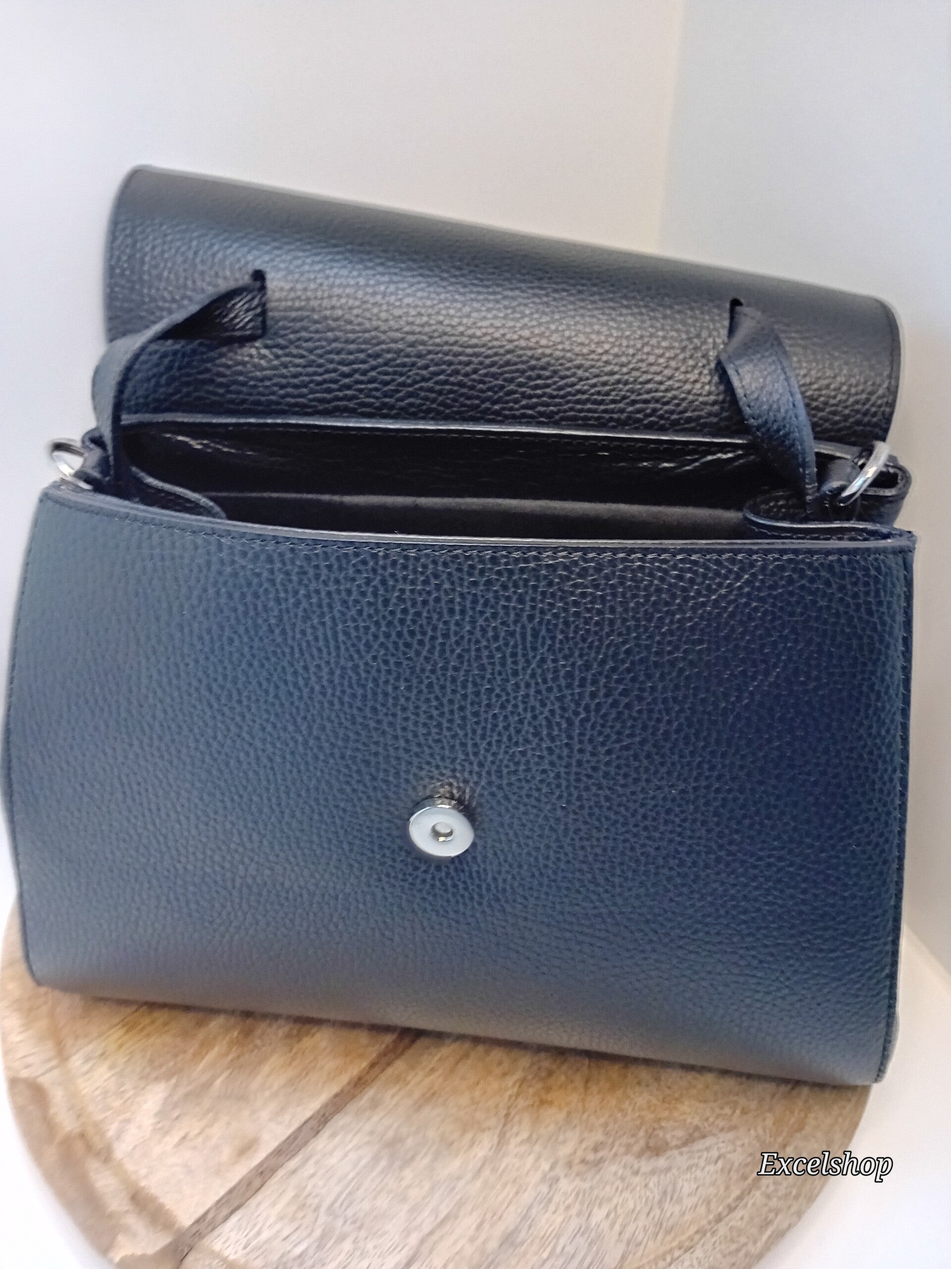 Lederen handas met handvat en schouderband donkerblauw