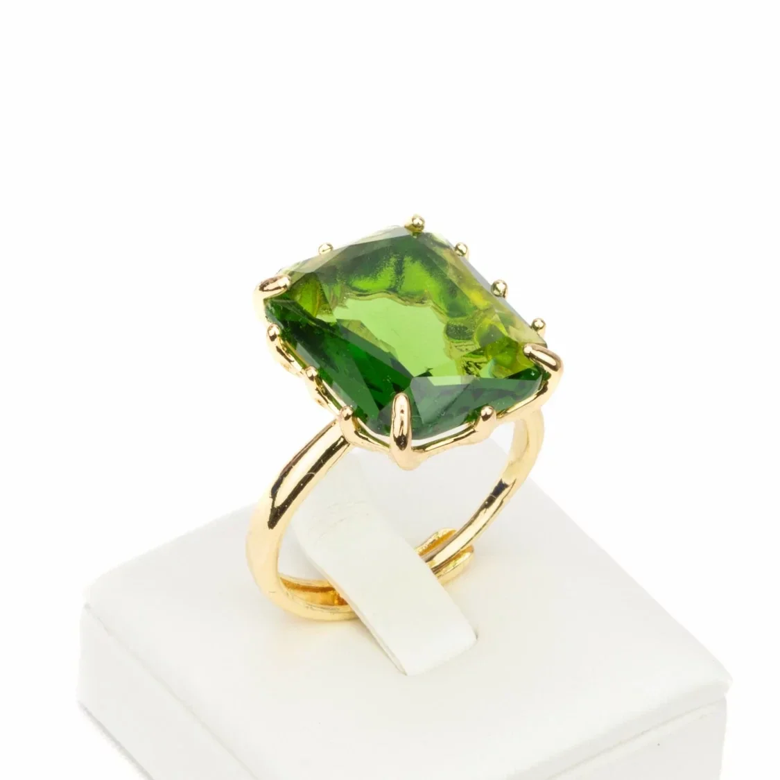 Bronzen ring met CZ cabochon kristallen rechthoek 15x20mm verstelbare maat peridot