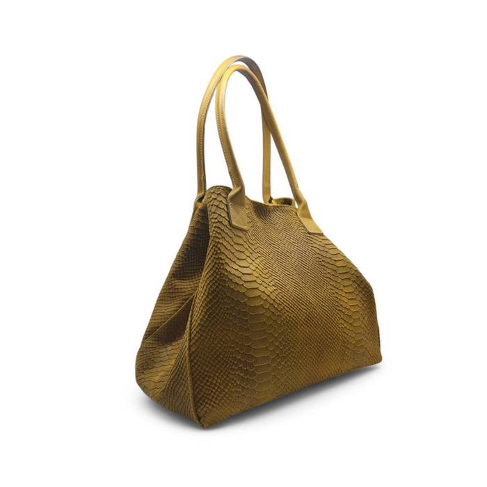 Schoudertas van echt leer met pythonprint, gemaakt in Italië. Dubbele handvatten, waardoor het gemakkelijk met de hand of op de schouder te dragen is. De tas heeft een centrale synthetische en een magnetische knoopsluiting. Het enkele binnenvak is met stof gevoerd en heeft een vak met verbrand. De leren tas Lola is een elegante en trendy modeaccessoire die perfect is voor een uitje met vrienden, om naar het werk te gaan.